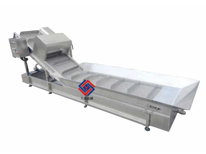 本機(jī)主要用于蔬果提升和清洗前的預(yù)洗,提升處安裝有噴淋裝置,可以減少進(jìn)入洗菜機(jī)的清洗時(shí)間,下面安裝有接水盤和和水泵,它們是收集水和讓水循環(huán)使用的作用。是蔬果加工配套設(shè)備的主要輔助機(jī)械。